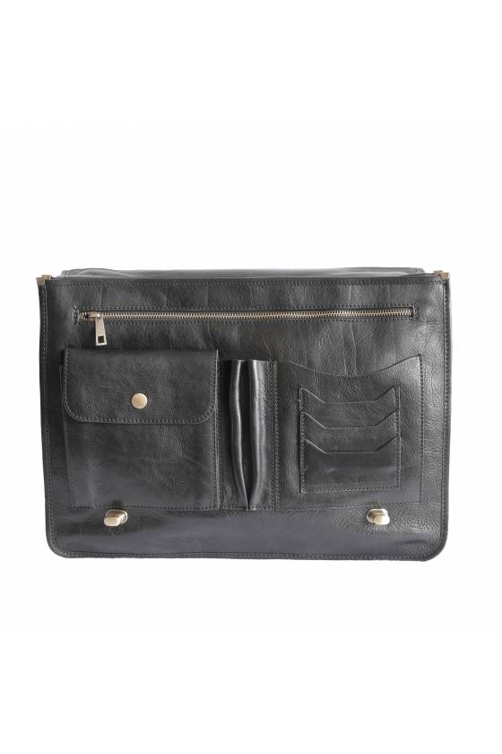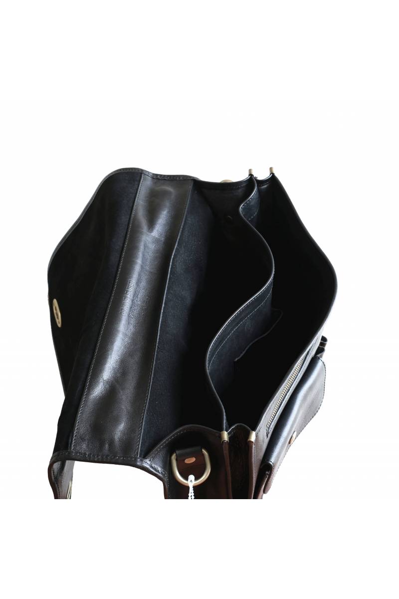 Servieta dama, port laptop din piele naturala, doua compartimente principale, un buzunar inchis cu fermoar, doua buzunare exterioare din care unul inchis cu capac, sistem de inchidere cu capac si accesorii metalice, curea de umar reglabila, detasabila, din piele naturala.Produsa in Italia.