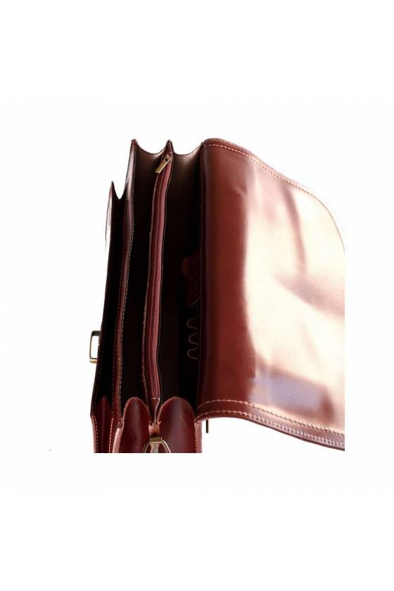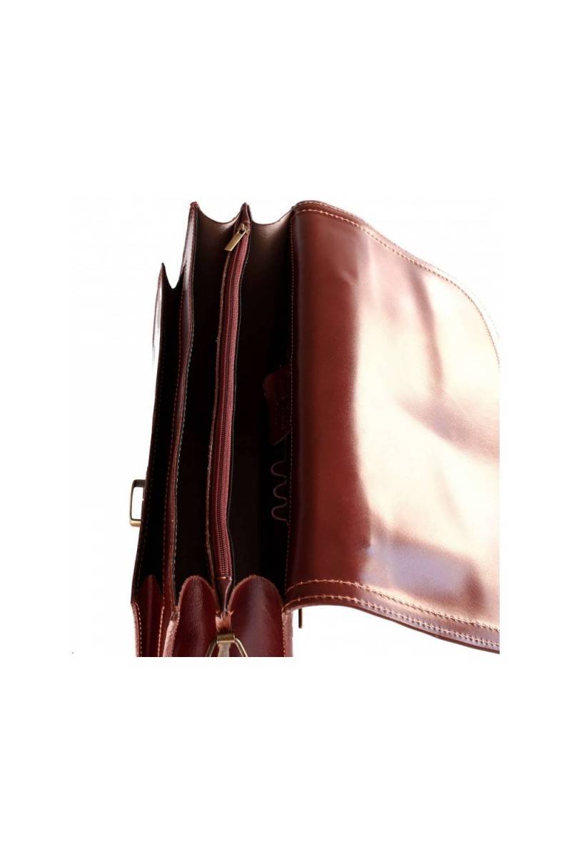 Servieta piele naturala cu doua compartimente, buzunar interior inchis cu fermoar, buzunar pe spate inchis cu fermoar, buzunar aplicat pe fata , buzunar interior pentru telefon, buzunar penru carduri, inchidere cu capac si accesoriu metalic, curea de umar din piele naturala, detasabila.Fabricata in Italia.
