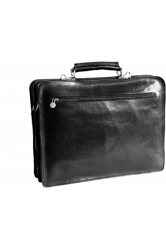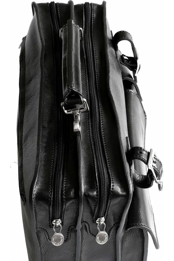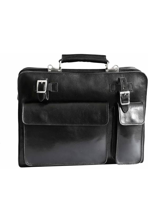 Geanta office din piele naturala vachetta, la interior doua compartimente individuale inchise cu fermoar, suporturi pe captuseala pentru pixuri, carduri, celular, buzunare aplicate pe fata si inchise cu butoni magnetici, curele reglabile pentru ziar/umbrela, curea de umar din piele reglabila si detasabila, captuseala din piele naturala spalt, constructie rigida, greutate 1,2 kg, pentru un laptop de 15 '', buzunar exterior cu fermoar. Made in Italy.