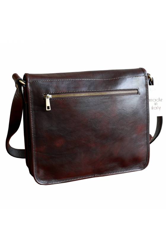 Geanta de umar, messenger, din piele naturala, doua compartimente, un buzunar interior si unul exterior inchise cu fermoar, curea de umar din piele naturala, reglabila, inchidere cu capac si doi butoni magnetici, dimensiuni:30x9x28.Fabricata in Italia.